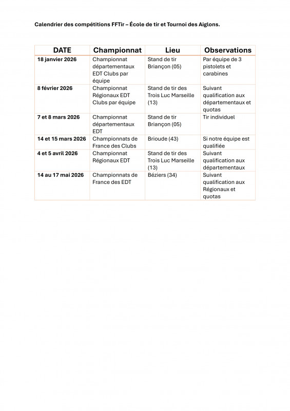 Calendrier des compétitions FFTir – École de tir et Tournoi des Aiglons.