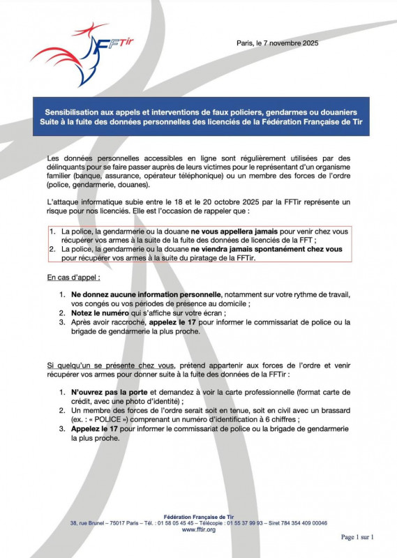 Suite à la fuite des données personnelles des licenciés de la Fédération Française de Tir