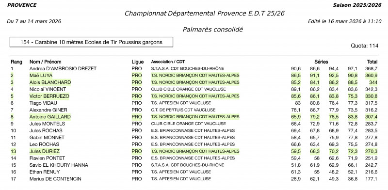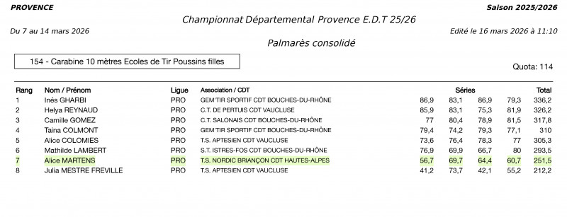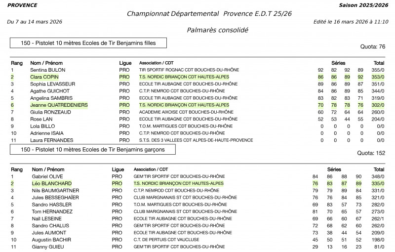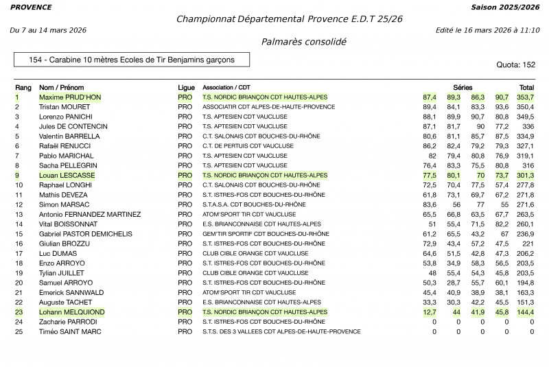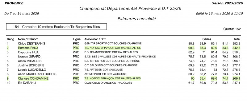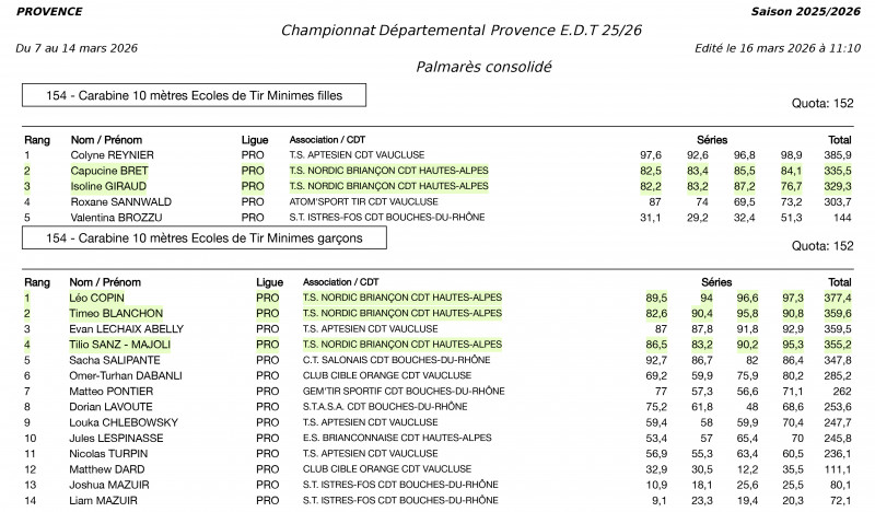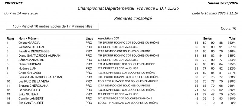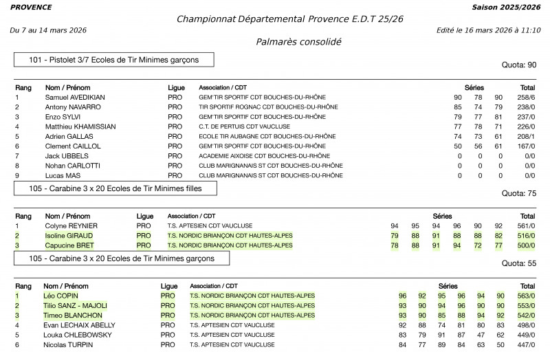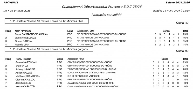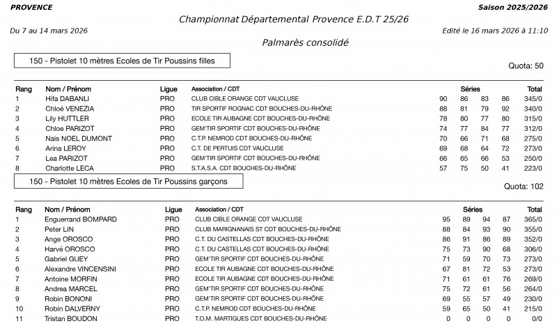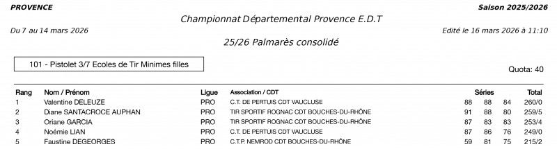 Résultats définitifs du Championnat Départemental de la ligue de tir de Provence Ecole De Tir 2026.